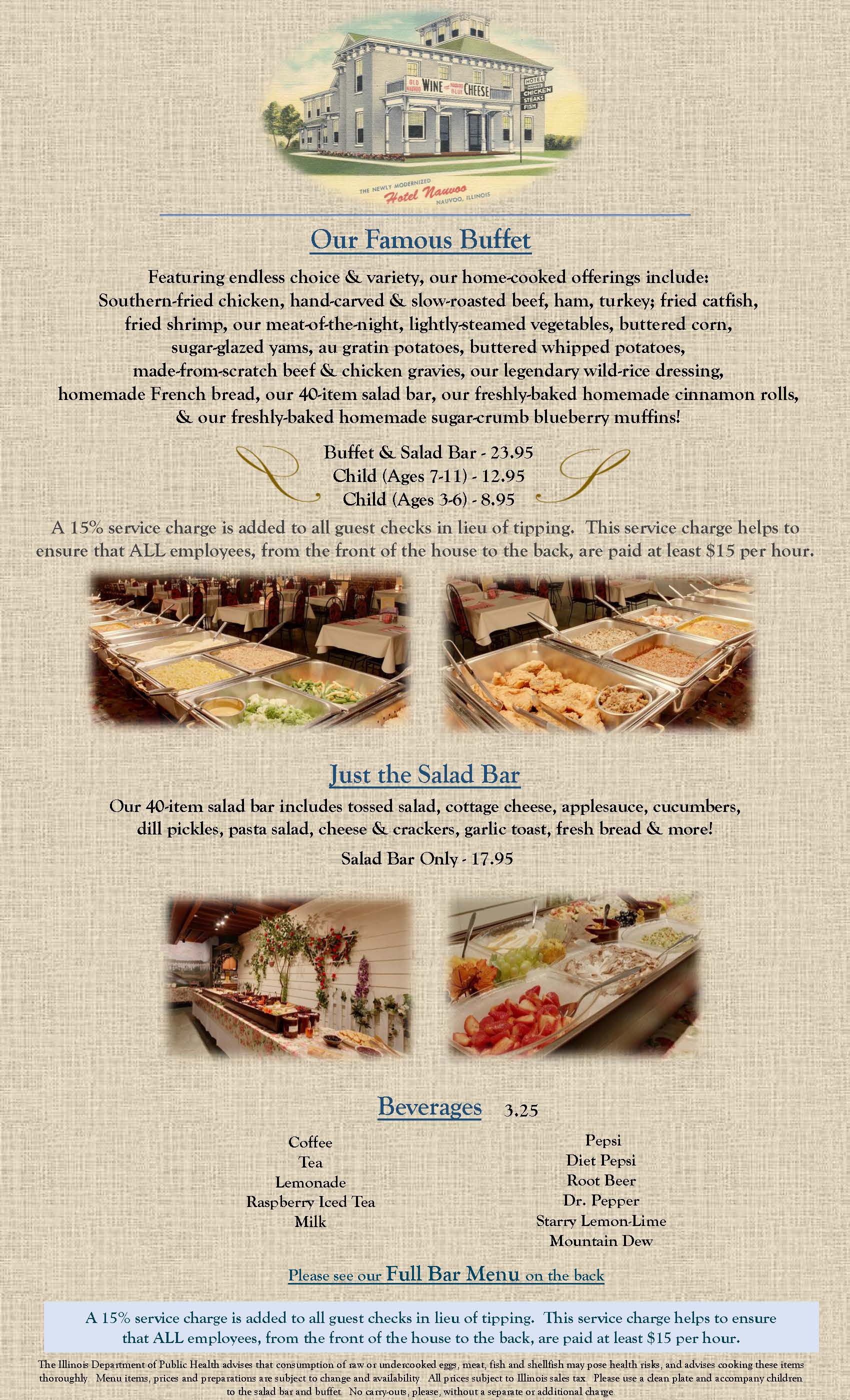 HISTORIC NAUVOO HOTEL CIRCA 1841: FULLY RESTORED OVERNIGHT ROOMS & A FAMOUS BUFFET SERVED FRIDAY EVENINGS & SATURDAY EVENINGS FROM 4:30 PM TO 7:30 PM. WE DO NOT UTILIZE ANY ONLINE BOOKING SERVICES. IF YOU SEE AN AD FOR ONLINE BOOKING, IT IS NOT FOR ONE OF OUR ROOMS.